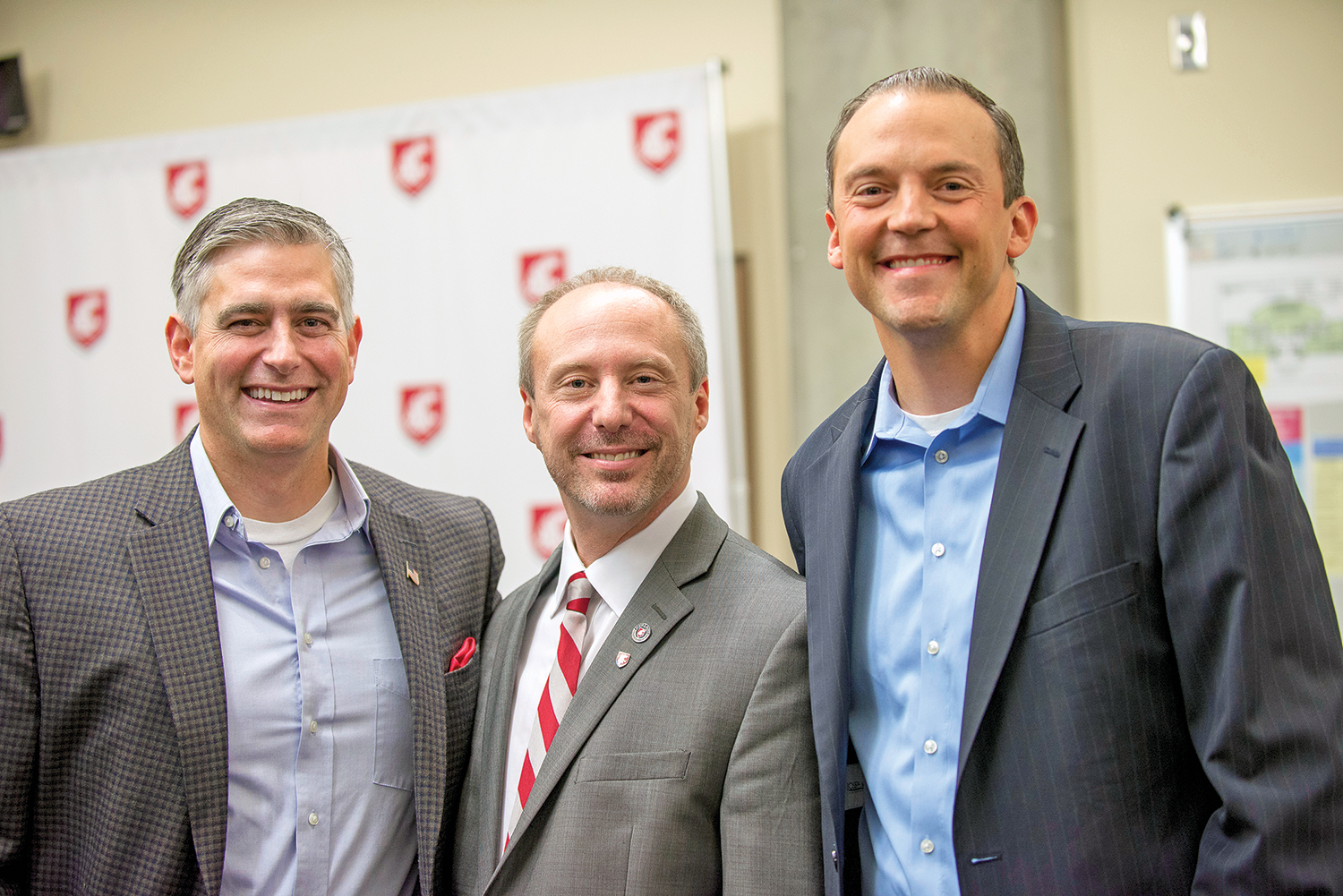 Elson S. Floyd College of Medicine Dean John Tomkowiak, center, celebrates with Sen. Michael Baumgartner (left) and Rep. Marcus Riccelli (right)