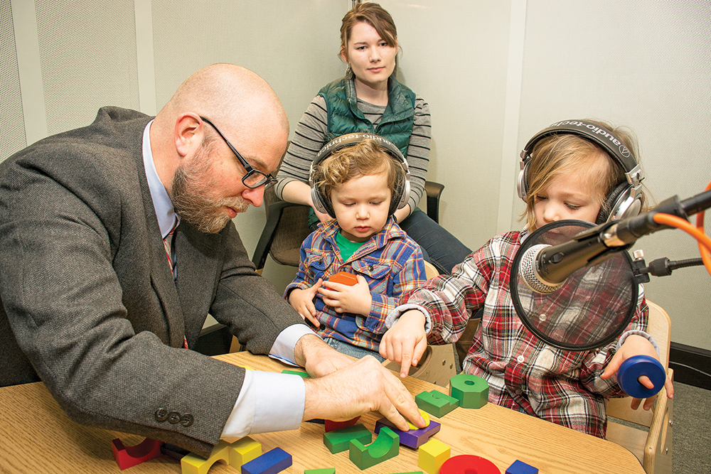 Assistant Professor of Speech and Hearing Sciences Mark VanDam works with young children at the Speech and Language Laboratory.